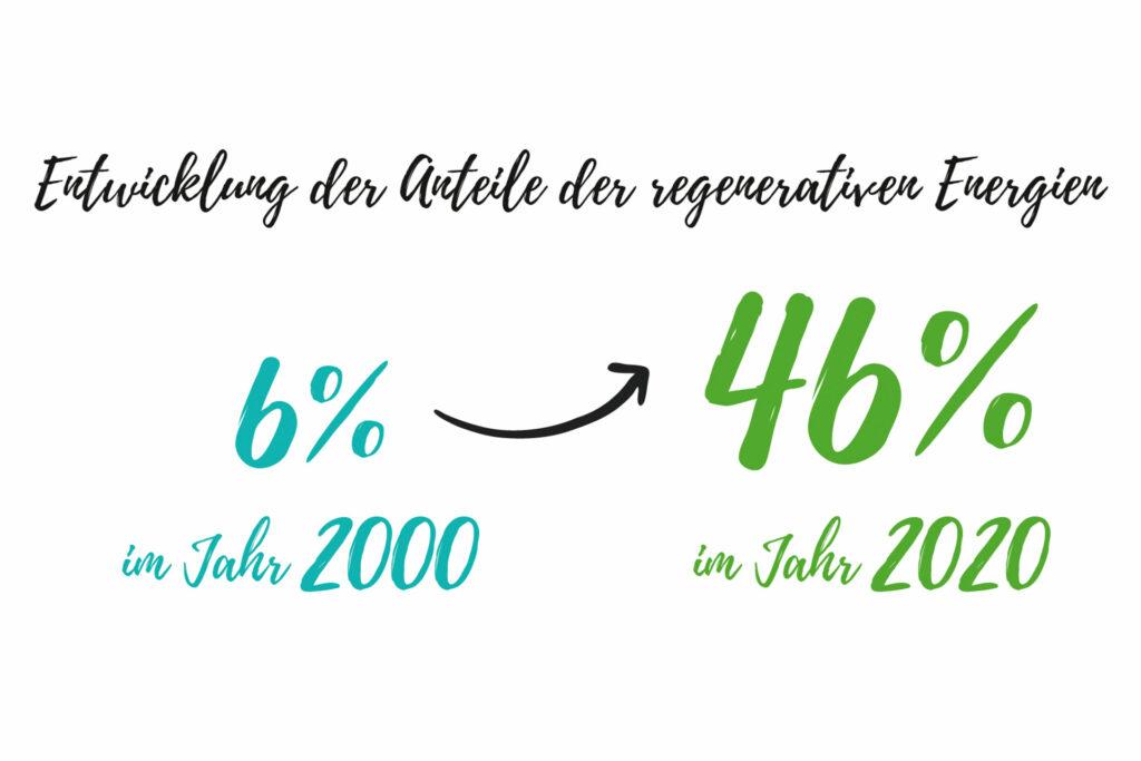 Anteil der erneuerbaren Energien am „Stromsee“ in Deutschland: Lag der Anteil der erneuerbaren Energien im Jahr 2000 noch bei sechs Prozent, stieg er mittlerweile bis auf 46 Prozent – Tendenz steigend.
